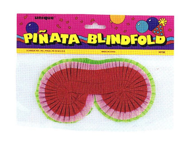 Don't peek! Pinata Blindfold is colorful with red, purple and green colors in a pleated paper with elastic cord.