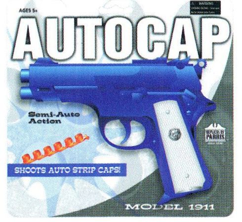 This Autocap Handgun 1911 is designed after an original model. Constructed of high quality durable plastic, features semi-auto action. Blue with white handle. Auto eject caps - action barrel. 8 inches long. Fires item 915 strip caps.