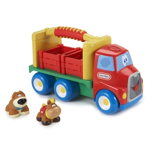 The perfect take-along friend, this fun "first truck" has its own face and personality to promote imaginative play and storytelling. Press the button on the truck cab to hear a song and animal sounds. Includes removeable animals and pens for added play. The unique soft-grip handle makes toting this special friend everywhere easy. Chunky design and six wheels offer stability during knee play. Batteries included. Replace with 2 "AA" alkaline batteries (not included). Ages 1 to 4 years.