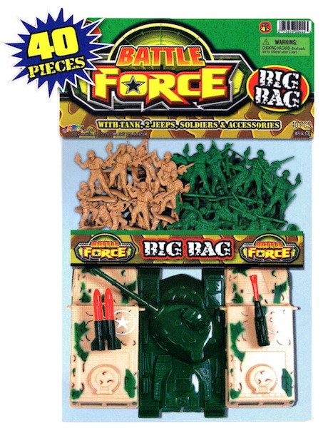 Move it out, soldiers! Save the world from all danger with this bag of armed forces. Includes tank, 2 jeeps, soldiers, & military accessories. Ages 4+