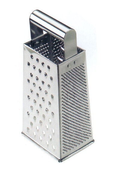 The Progressive deluxe box grater features a comfortable and sturdy grip handle. The large hole grating surface on one side is for potatoes, the medium holes are for cheeses, and the small holes are for hard cheeses and chocolates. Handle and grater box are made with stainless steel. Dishwasher safe