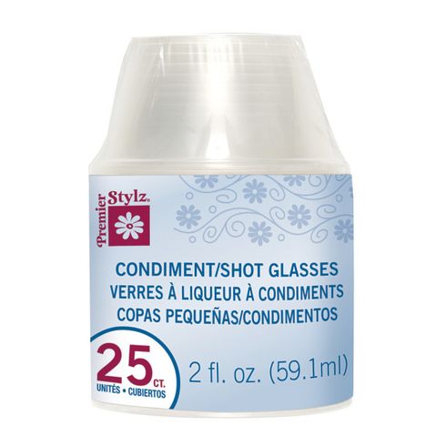 Pack of 25 small, clear plastic shot glasses.
