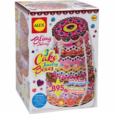 Bling Along 3 Cake Jewelry Boxes - Decorate, Stack and Store. Decorate your 3 boxes like a wild cake with tons of stickers and gems. Includes 720 sticky mosaic tiles, 175 sticky gems, 72 stickers, 3 stacking jewelry boxes with lids and easy instructions. Ages 6 and up.