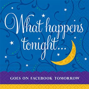 Text: "What happens tonight...goes on facebook tomorrow". (20) 25x25cm cocktail napkins per pack.