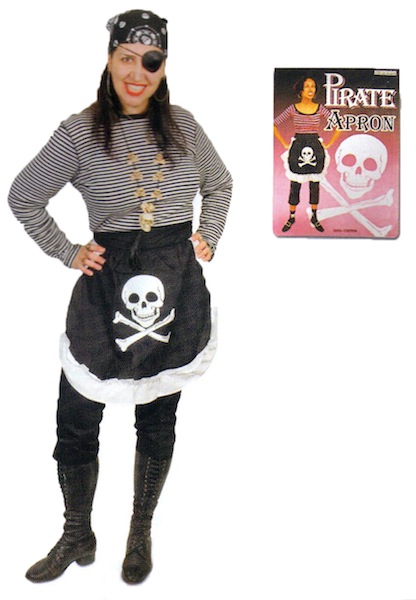 This saucy Pirate Apron will have you plundering the pantry and swabbing the kitchen counters in no time. Each 28" x 23" 100% cotton apron perfectly combines the frilliness of a french maid with the frightfulness of the Jolly Roger.