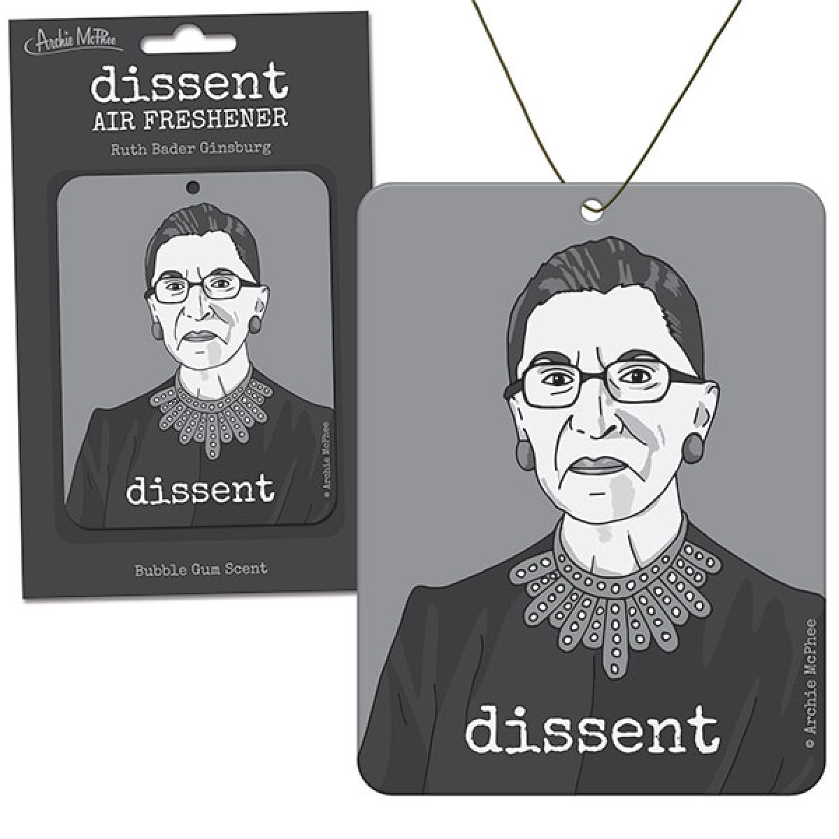 Supreme Court Justice Ruth Bader Ginsburg has a special collar she wears when she dissents from a majority opinion. This 4_" (10.8 cm) tall heavy cardstock air freshener will "de-scent" your car with a delicious bubblegum smell. String for hanging included. Illustrated cardboard sleeve.