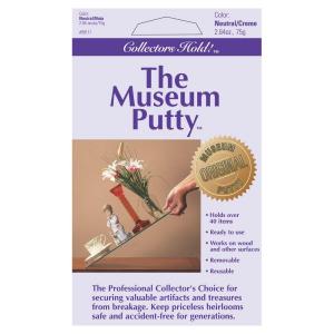 "A miracle removable putty that holds securely in place valuable crystal, glass, vases and more from accidental breakage, theft and earthquakes. Proven to deter theft and breakage, yet removes easily with a twist. It works and so simple to use! Holds 40 plus+ items. Is removable and reusable. Excellent for: Antiques, Collectibles, Plates, Glassware, Statues, Figurines, Vases, Crystal, Pottery, Pictures, Bottles, Steins, in RV's & Boats too; The uses are endless! Collectors Hold! Works On: Glass Shelves, China Cabinets, Lacquered Wood, Furniture, Painted Gloss Wood and Walls, etc. Contains 2.64oz of product"