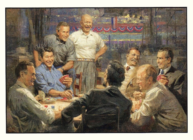 The Grand Old Gang Republican Presidential puzzle features: George H.W.Bush, Abraham Lincoln, Gerald Ford, Richard Nixon, Teddy Roosevelt, Dwight Eisenhower, George W.Bush and Ronald Reagan. Gather around and have a great time with these Republican Presidents. This puzzle is Eco-Friendly and printed with Soy-Based Inks on Recycled Board. Proudly made in the USA. 500 Pieces Puzzle Size: 13" x 19"