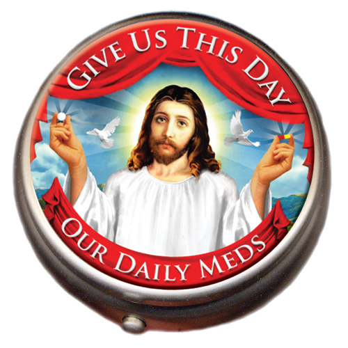 Some people believe in the power of prayer to heal them. Others trust modern medicine. Why not combine the best of both worlds with the Jesus Pill Box? This attractive, high-chrome pillbox features an inspiring image of Jesus holding out pills in his outstretched hands. The words "Give Us This Day Our Daily Meds" wrap around him. The interior of the pillbox is divided into sections, but the divider can be removed if you want one large compartment or are a Unitarian. The Jesus Pill Box comes in a very attractive gift box and would make either a touching or amusing gift, depending on how you look at it.